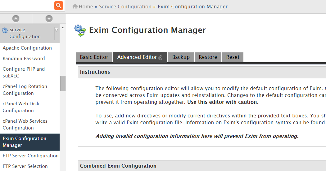 - Click on Service Configuration -> Exim Configuration Manger