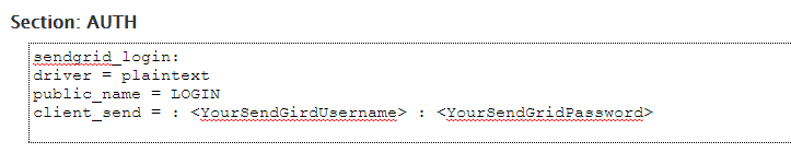 - Find the section called Section: AUTH and paste the following into the text box, substituting in your SendGrid username and password:
