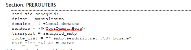 - Find the section called Section: PREROUTERS paste the following in the textbox, substituting in your Domain name in the senders line:
